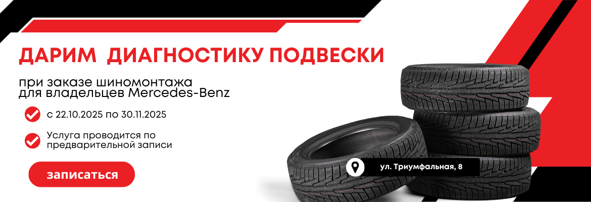 С 22 октября по 30 ноября 2025 года при прохождении шиномонтажа в нашем сервисе вы можете получить бесплатный осмотр подвески вашего автомобиля.